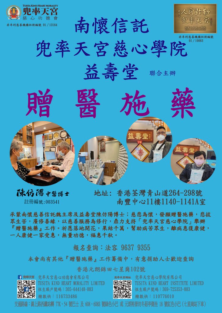 感恩南懷基金會樂善好施捐贈藥費,解決病患困苦。 感恩益壽堂陳仿陽博士愛心義診,義務服務解除病人痛苦。